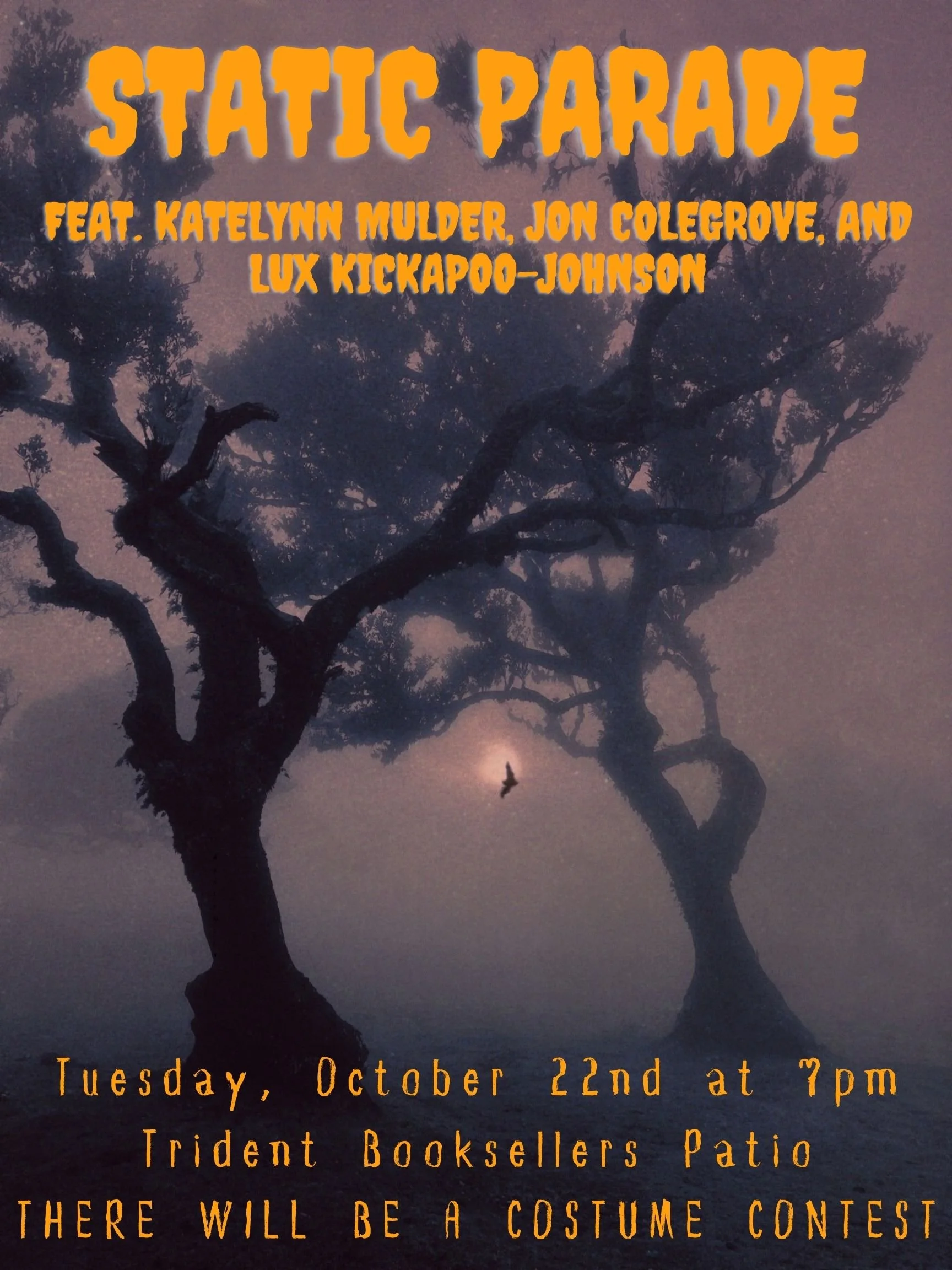 Static Parade is a reading series hosted by the CU Boulder creative writing MFA students. Every semester, this series introduces new writers from our program to the larger Boulder community through our longstanding partnership with Trident Booksellers. Please join us to hear three of our writers of either fiction or poetry share their latest work for about twenty minutes each, with a short intermission.