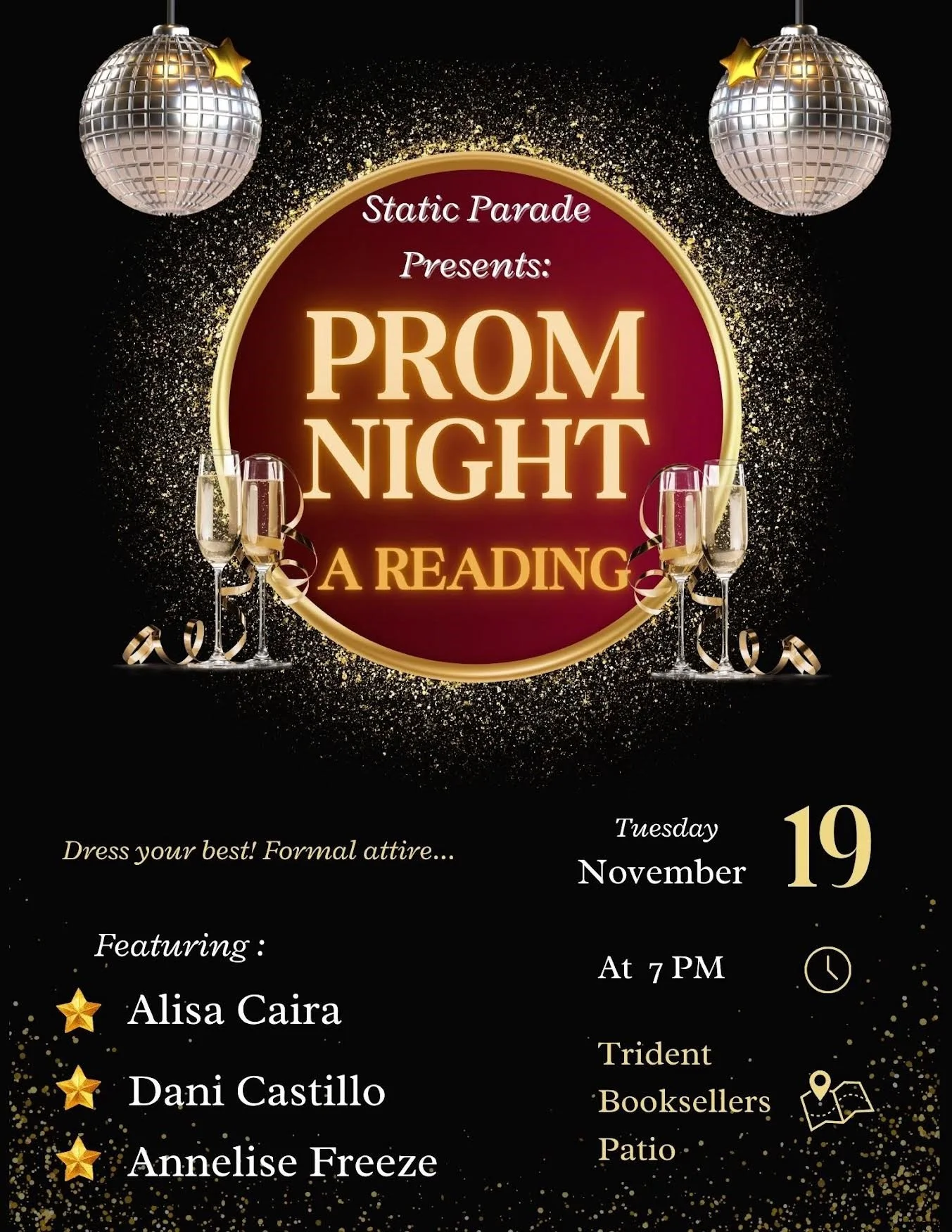 Static Parade is a reading series hosted by the CU Boulder creative writing MFA students. Every semester, this series introduces new writers from our program to the larger Boulder community through our longstanding partnership with Trident Booksellers. Please join us to hear three of our writers of either fiction or poetry share their latest work for about twenty minutes each, with a short intermission.