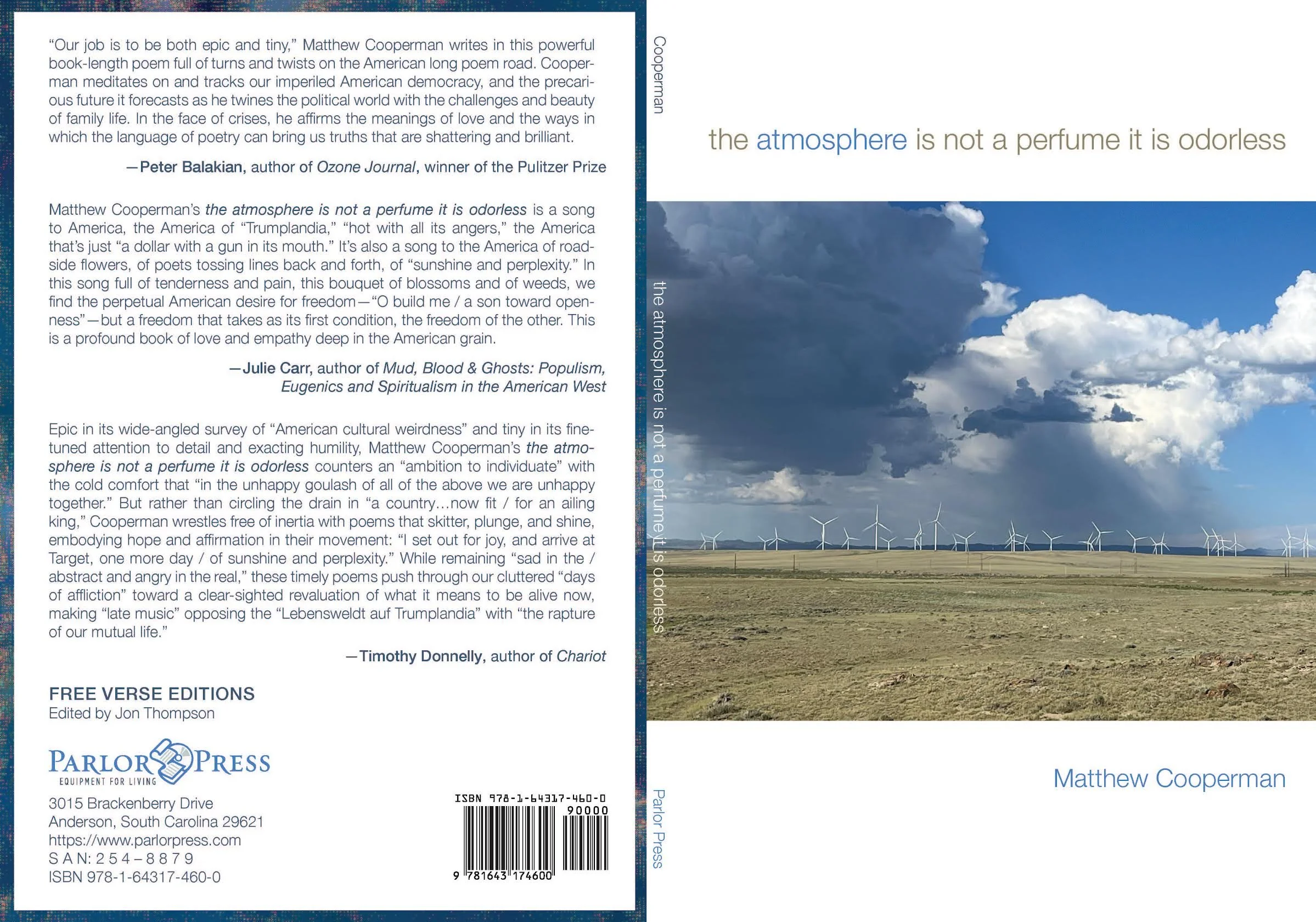 Matthew Cooperman is the author of, most recently, the atmosphere is not a perfume it is odorless (Free Verse Editions/Parlor Press, 2024) and Wonder About The, winner of the Halcyon Prize (Middle Creek, 2023) as well as NOS (disorder, not otherwise specified), w/Aby Kaupang, (Futurepoem, 2018), Spool, winner of the New Measure Prize (Free Verse Editions/Parlor Press, 2016), and other books. His ninth book, Time, & Its Monument, is forthcoming from Station Hill Press. Cooperman is a 2025 Guggeheim Fellow in Poetry and Professor of English at Colorado State University. He lives in Fort Collins with his wife, the poet Aby Kaupang. More info at http://matthewcooperman.org