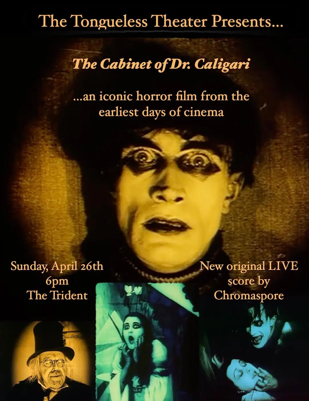 The Trident is proud to present a new series we are calling, "The Tongueless Theater." Bringing to the Trident stage, screenings of silent films from the past, present, and future, featuring original scores and soundtracks performed by local composers and musicians.